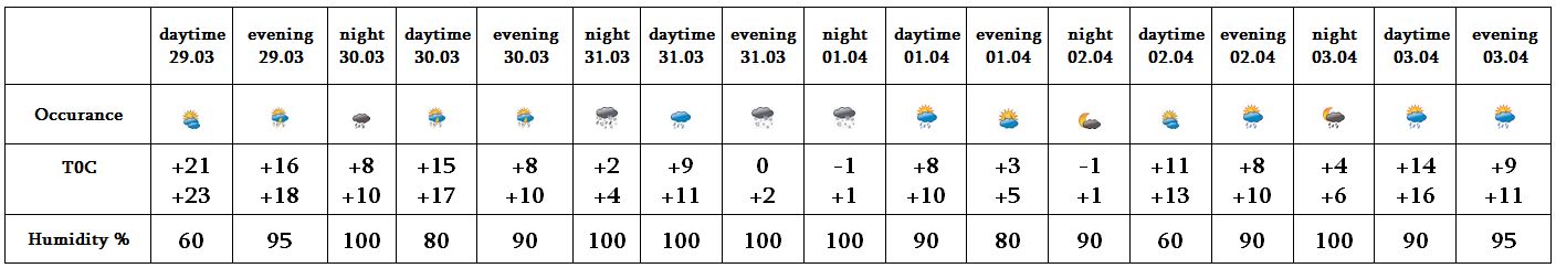 On March 29 and in evening of April 2 short-term rain with thunderstorm is possible. On March 30 and on April 3 rain with thunderstorms is predicted. On March 31 and on April 1 no precipitation is predicted, in the evening of 31 in the highlands of the city in the form of snow. On March 29 the wind speed may reach up to 15-18 m/s.