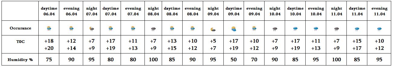 In the afternoon of April 6, on 7, in the late evening of 9 short-term rain with thunderstorms is predicted. On April 8, on 10-11 from time to time rain is predicted. At night of April 9 no precipitation is predicted.