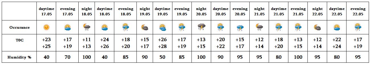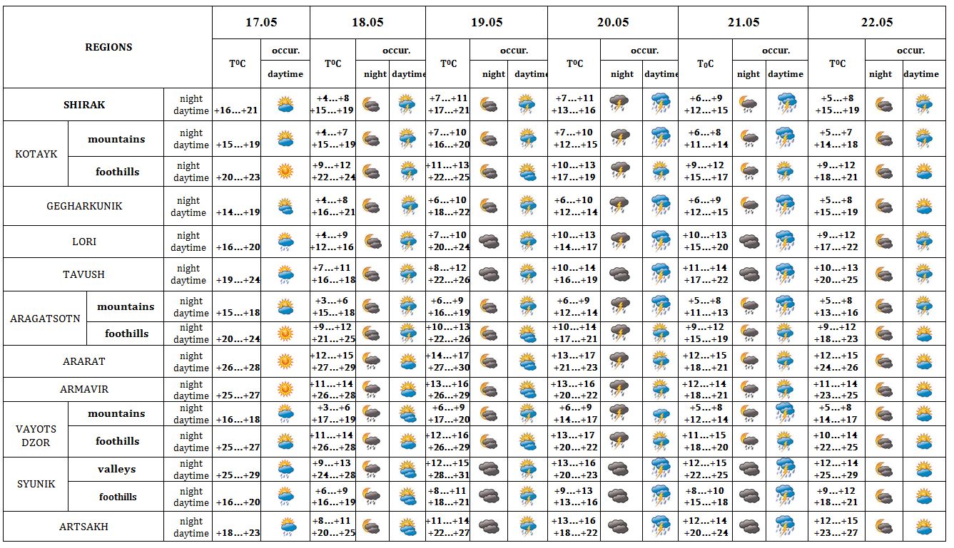 On May 18-19, in the evening of 22 short-term rain with thunderstorm is possible, on 20-21 it is predicted, during thunderstorm the wind speed may reach up to 13-15 m/s.