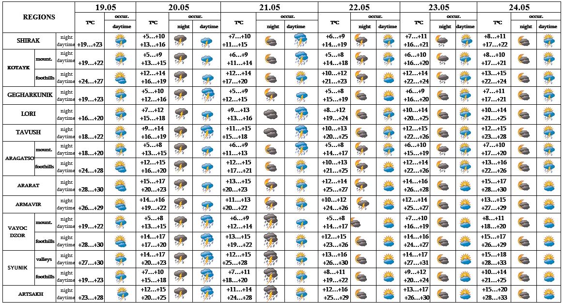In the daytime of May 19, on 22-24 in separate regions,on 20-21 in most regions short-term rain with thunderstorm is predicted, on 20-21 in separate parts – intensive. On May 20 in separate regions fog is possible, on 20-24 hail is also possible.