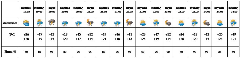 In the daytime of May 19, on 22-24 short-term rain with thunderstorm is possible, on 20-21 short-term rain with thunderstorm is predicted, during thunderstorm the wind speed may reach up to 14-18 m/s.