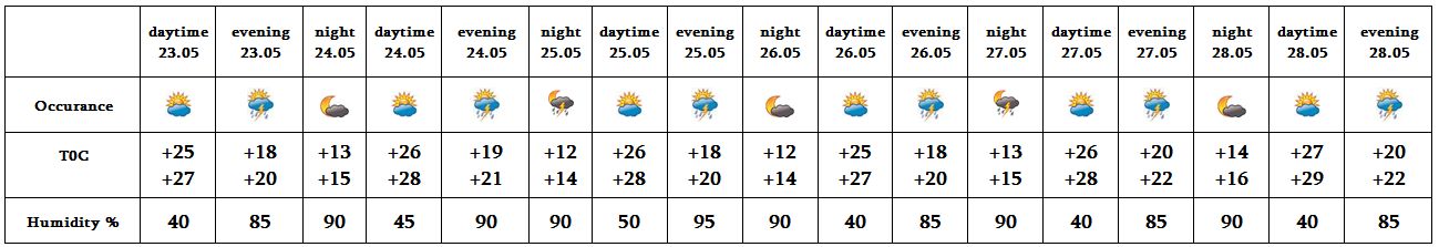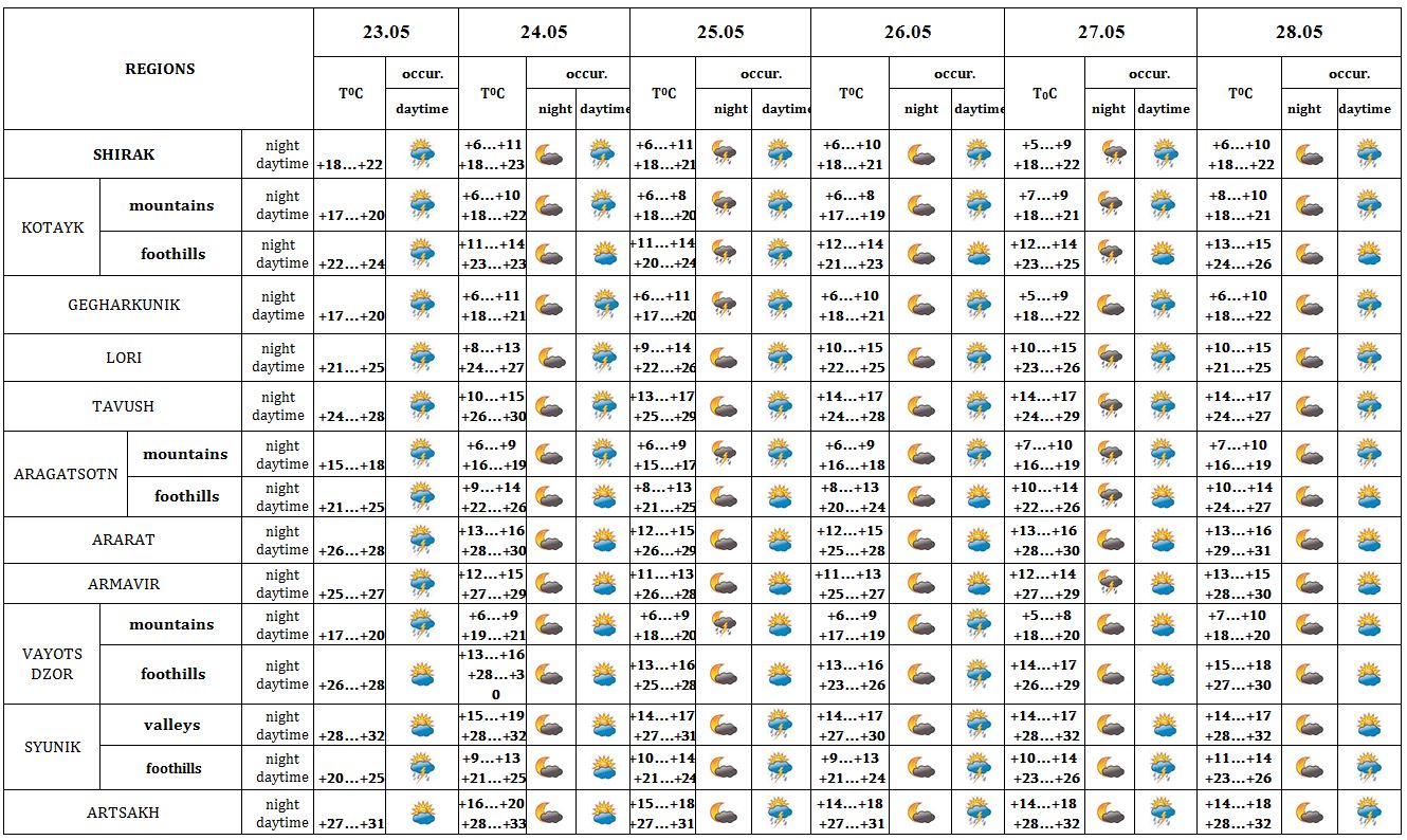 On May 23, in the evening of 24-28 short-term rain with thunderstorm is possible, during thunderstorm the wind speed may reach up to 14-18 m/s.