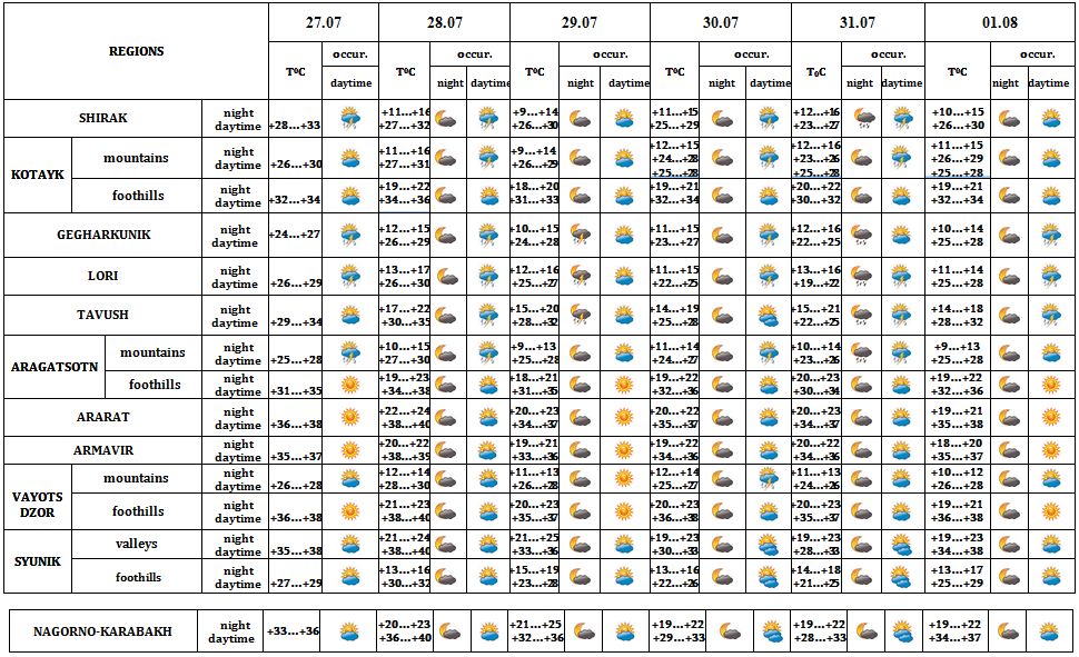 On July 27-28 the air temperature will gradually go up by 2-4 degrees, on 29-31 will gradually go down by 3-5 degrees, in Lori, Tavush, Syunik provinces and Nagorno-Karabakh - by 8-10 degrees.