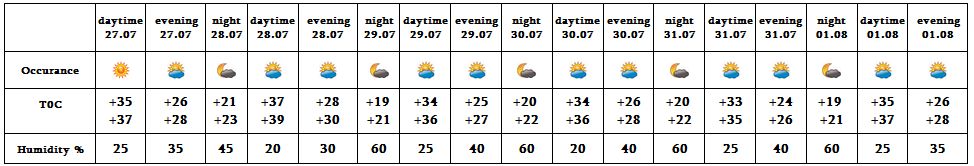 In the daytime of July 27 and 28, at night of 29, in the afternoon of 30-31 and August 1 in separate regions short-term rain with thunderstorm is predicted. In the daytime of July 29 no precipitation is predicted.