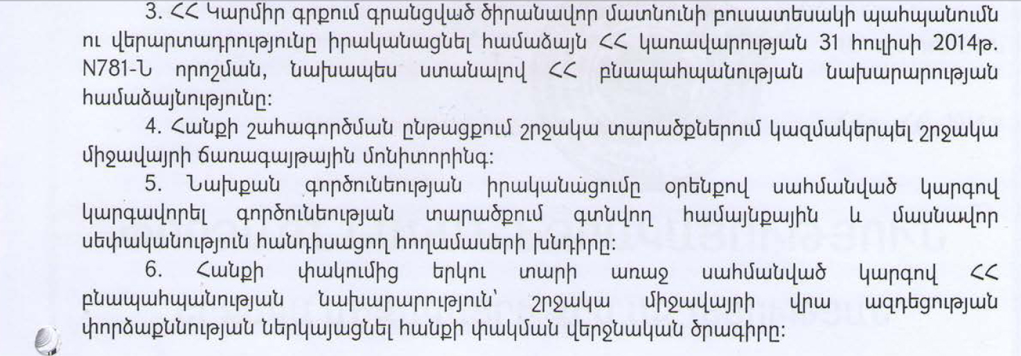 Պահանջ 3. ՀՀ Կարմիր գրքում գրանցված ծիրանավոր մատնունի բուսատեսակի պահպանումն ու վերարտադրությունն իրականացնել համաձայն ՀՀ կառավարության 31 հուլիսի 2014թ. N781-Ն որոշման` նախապես ստանալով ՀՀ բնապահպանության նախարարության համաձայնությունը: