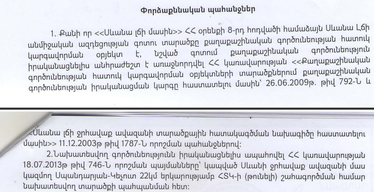Քանի որ «Սևանա լճի մասին» ՀՀ օրենքի 8-րդ հոդվածի համաձայն Սևանա լճի անմիջական ազդեցության գոտու տարածքը քաղաքաշինական գործունեության հատուկ կարգավորման օբյեկտ է, նշված գոտում քաղաքաշինական գործունեություն իրականացնելիս, անհրաժեշտ է առաջնորդվել ՀՀ կառավարության «Քաղաքաշինական գործունեության հատուկ կարգավորման օբյեկտների տարածքներում քաղաքաշինական գործունեության իրականացման կարգը հաստատելու մասին» 26.06.2009թ. թիվ 792-Ն և «Սևանա լճի ջրհավաք ավազանի տարածքային հատակագծման նախագիծը հաստատելու մասին» 11.12.2003թ. թիվ 1787-Ն որոշման պահանջներով: