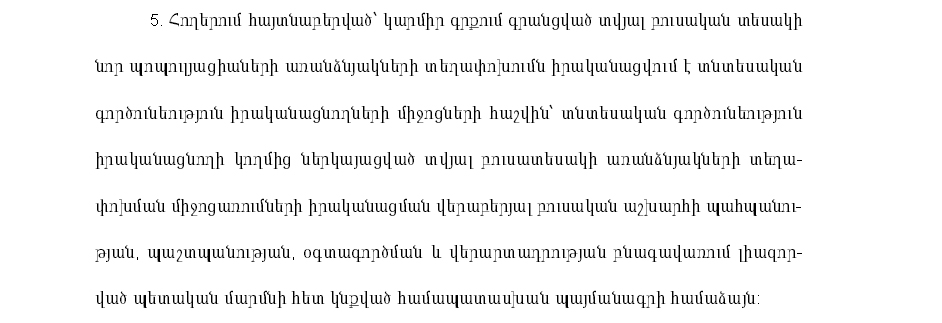 Պահանջ 5. «Նախքան գործունեության իրականացումը օրենքով սահմանված կարգով կարգավորել գործունեության տարածքում գտնվող համայնքային և մասնավոր սեփականություն հանդիսացող հողամասերի խնդիրը»:
