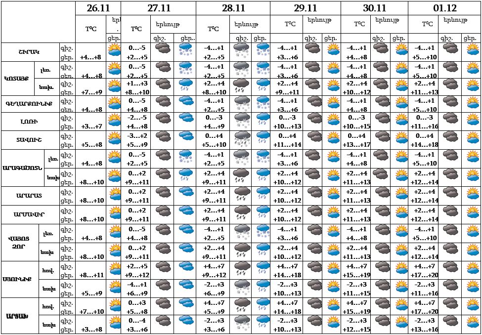 Օդի ջերմաստիճանը նոյեմբերի 27-ի գիշերն ամենուրեք կբարձրանա 8-10, 26-30-ը ցերեկը Լոռիում, Տավուշում, Սյունիքում և Արցախում աստիճանաբար կբարձրանա 8-10, մնացած շրջաններում՝ 4-5 աստիճանով: