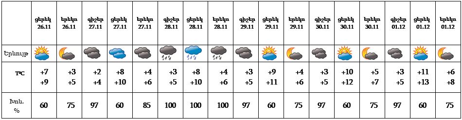 Նոյեմբերի 26-ի ցերեկը, 29-30-ը, դեկտեմբերի 1-ին սպասվում է առանց տեղումների եղանակ, 27-ի ցերեկը քաղաքի առանձին հատվածներում հնարավոր է, 28-ին սպասվում է անձրև։