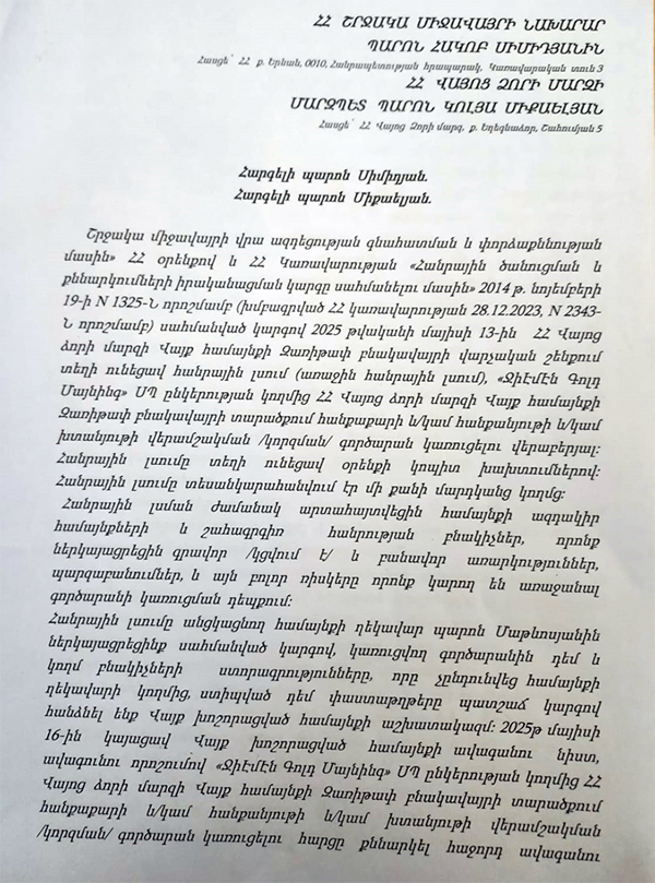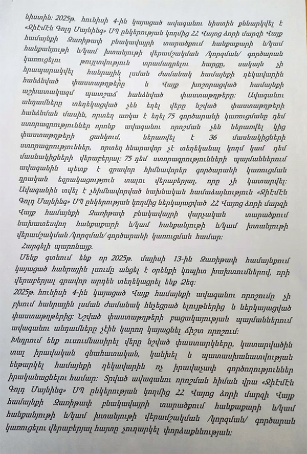 մենք գտնում ենք որ 2025թ. մայիսի 13-ին Զառիթափ համայնքում կայացած հանրային լսումն անցել է օրենքի կոպիտ խախտումներով, ինչի վերաբերյալ գրավոր արդեն տեղեկացրել ենք Ձեզ։ 2025թ. հունիսի 4-ին կայացած Վայք համայնքի ավագանու որոշումը չի բխում հանրային լսման ժամանակ հնչեցրած ելույթներից և ներկայացված փաստաթղթերից: Նշված փաստաթղթերի բացակայության պայմաններում ավագանու անդամները չէին կարող կայացնել ճիշտ որոշում։