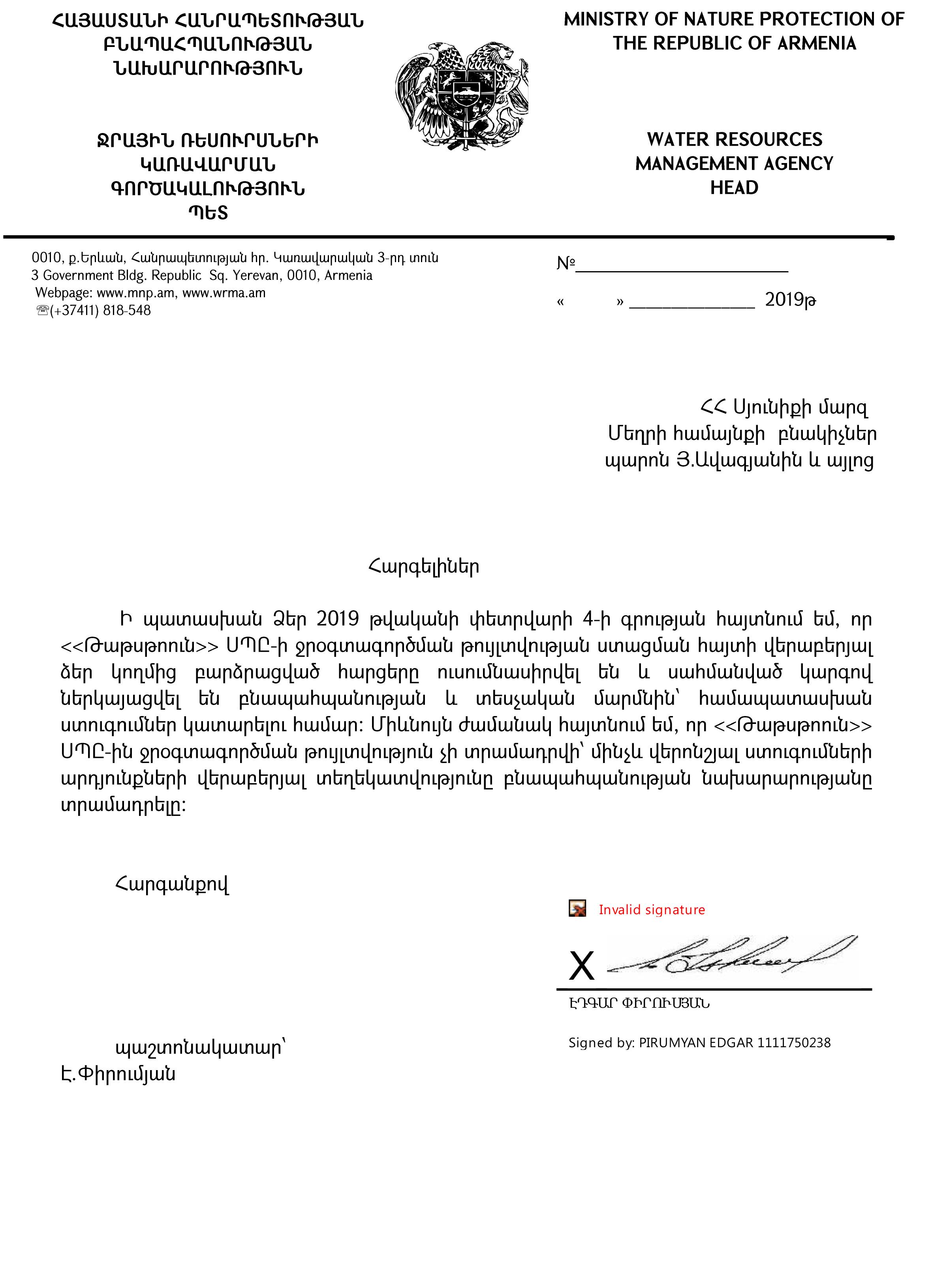 «Ի պատասխան Ձեր 2019 թ-ի փետրվարի 4-ի գրության հայտնում եմ, որ «Թաթսթոուն» ՍՊԸ-ի ջրօգտագործման թույլտվության ստացման հայտի վերաբերյալ ձեր կողմից բարձրացված հարցերը ուսումնասիրվել են և սահմանված կարգով ներկայացվել են բնապահպանության և տեսչական մարմնին՝ համապատասխան ստուգումներ կատարելու համար: Միևնույն ժամանակ հայտնում եմ, որ «Թաթսթոուն» ՍՊԸ-ին ջրօգտագործման թույլտվություն չի տրամադրվի՝ մինչև վերոնշյալ ստուգումների արդյունքների վերաբերյալ տեղեկատվությունը բնապահպանության նախարարությանը տրամադրելը», - նշված է Էդգար Փիրումյանի նամակում: