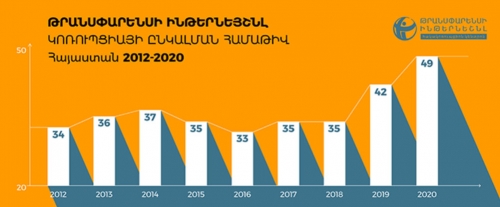 Հայաստանը 2020թ․ բարելավել է կոռուպցիայի ընկալման համաթիվը (ԿԸՀ) 7 միավորով՝ հասնելով 49-ի: Հունվարի 28-ին «Թրանսփարենսի Ինթերնեշնլ» կազմակերպության կողմից հրապարակված կոռուպցիայի ընկալման 2020թ. աղյուսակի համաձայն՝ Հայաստանի արձանագրած նման բերալավումը դիտվում է երկրորդ տարին անընդմեջ: 2019թ. Հայաստանի ԿԸՀ-ն կազմում էր 42, իսկ 2018թ.՝ 35: Ի դեպ, 2012-2018թթ. միջև ընկած ժամանակահատվածում Հայաստանի ԿԸՀ ցուցանիշը երբևէ բարձր չի եղել չորս տասնյակից: Այս աճի մեծությամբ Հայաստանն աշխարհում զիջում է միայն Մալդիվյան կղզիներին, որի 2020թ․ ԿԸՀ արժեքը 2019թ. համեմատ աճել է 14 միավորով (29-ից 43):