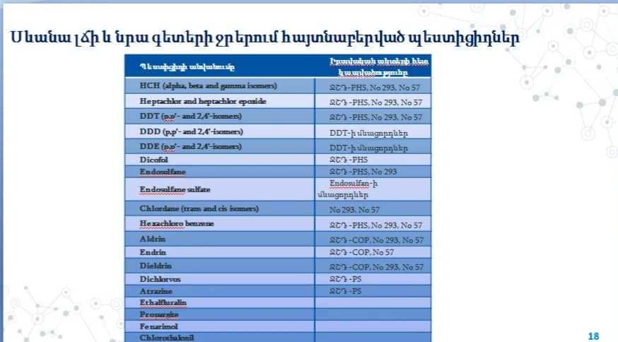 Շրջակա միջավայրի նախարարության հիդրոօդերևութաբանության և մոնիթորինգի կենտրոնի տնօրենի տեղակալ Գայանե Շահնազարյանը նշեց, որ ՀՀ ԳԱԱ Նալբանդյանի անվան քիմիական ֆիզիկայի ինստիտուտի կողմից 2016-2018թթ. ընթացքում Սևանա լճի ավազանում իրականացված ուսումնասիրությունների արդյունքում ինչպես լճում, այնպես էլ գետերի նստվածքներում հայտնաբերվել են Հայաստանում կիրառության համար արգելված պեստիցիդներ կամ դրանց մնացորդներ: «Հիմնականում պեստիցիդները հայտնաբերվել են մեծ Սևանի հարավային հատվածում, գետերում, գետաբերանների հատվածներում, հիմնականում հատակային նստվածքներում: Սա հետևանք է ոչ միայն նախկինում կիրառված պեստիցիդների, այլև ներկայում ոչ պաշտոնական ձևով կիրառվող պեստցիդների»,- ասաց Գայանե Շահնազարյանը: