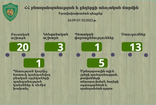 ՀՀ բնապահպանության և ընդերքի տեսչական մարմնի կողմից 2022թ. սեպտեմբերի 26-ից հոկտեմբերի 7-ն ընկած ժամանակահատվածում իրականացված վերահսկողության ընթացքում արձանագրվել է 29 դեպք, որից 23 դեպքով հաշվարկվել է 102.308.268 դրամի չափով շրջակա միջավայրին հասցված վնաս, 2 դեպքով նշանակվել է 130.000 դրամի չափով վարչական տուգանք։ Նախկինում արձանագրված 2 դեպքով հաշվարկվել է 47.700 դրամի չափով շրջակա միջավայրին հասցված վնաս, 13 դեպքով նշանակվել է 1.480.000 դրամի չափով վարչական տուգանք։