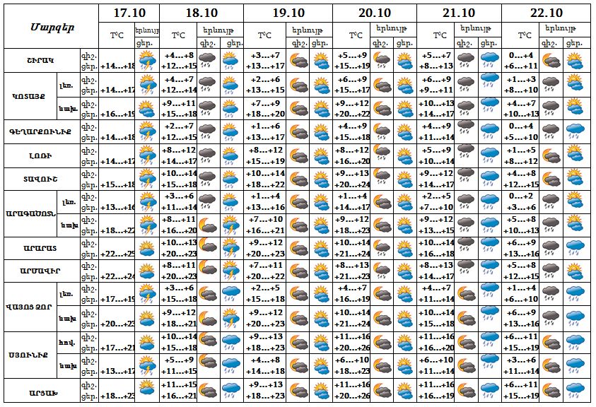 Հոկտեմբերի 17-ի ցերեկը, 18-ի և 20-ի գիշերը առանձին շրջաններում, 18-ի ցերեկը, 21-22-ը շրջանների զգալի մասում սպասվում է անձրև, 17-18-ը հովտային շրջաններում հնարավոր է նաև ամպրոպ: Հոկտեմբերի 19-ին, 20-ի ցերեկը սպասվում է առանց տեղումների եղանակ: