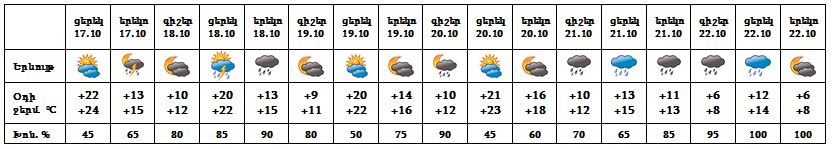 Հոկտեմբերի 17-ի երեկոյան, 18-ի ցերեկը, 20-ի գիշերը հնարավոր է կարճատև անձրև։ Հոկտեմբերի 21-22-ը սպասվում է անձրև: Հոկտեմբերի 19-ին, 20-ի ցերեկը սպասվում է առանց տեղումների եղանակ: