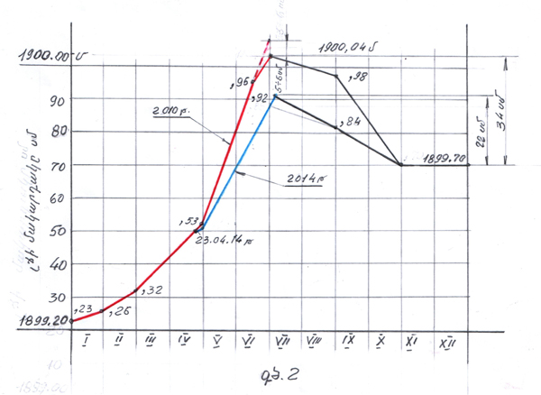 բ) Ջրի անկման (ելքի և գոլորշացման) ընդհանուր ծավալը լճից, իր առավելագույն մակարդակին հասնելուց հետո (ինչպես երևում է գծ.1-ում) այդ տարիների վերջին կազմել է 29+24+32+25+36+22=168 սմ (x12,5)=2,10 մլրդ խմ: