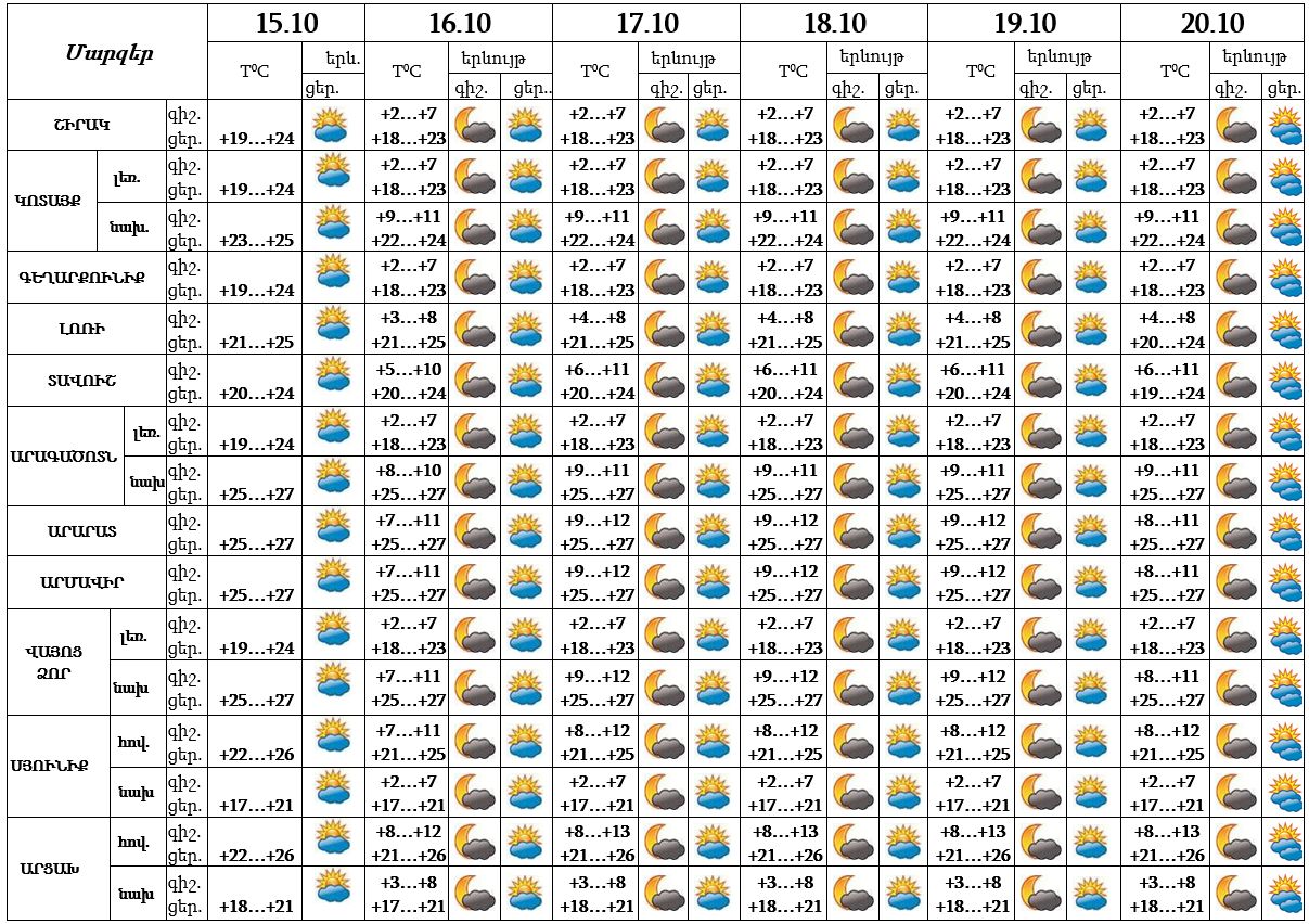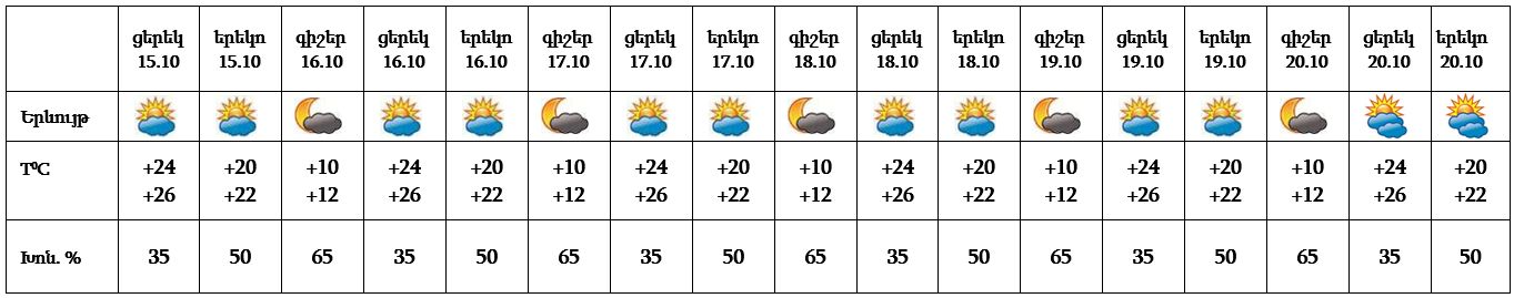 Հոկտեմբերի 15-ի ցերեկը, 16-20-ը սպասվում է առանց տեղումների եղանակ: