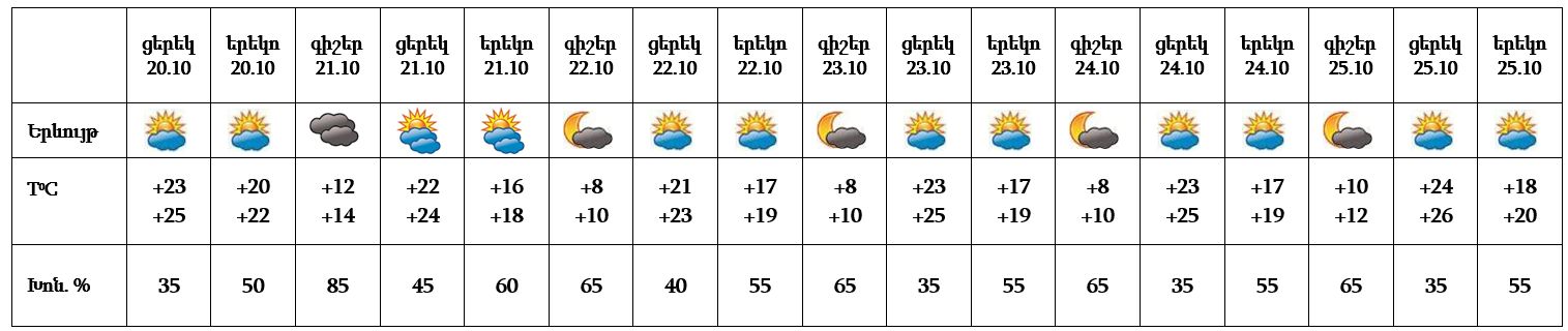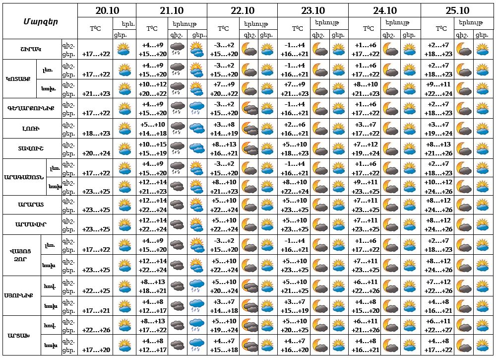 Օդի ջերմաստիճանը հոկտեմբերի 20-ի և 21-ի ցերեկն աստիճանաբար կնվազի 2-4 աստիճանով, Լոռիում, Տավուշում, Սյունիքում և Արցախում՝ 6-8 աստիճանով, 23-25-ը՝ նույնքան կբարձրանա։