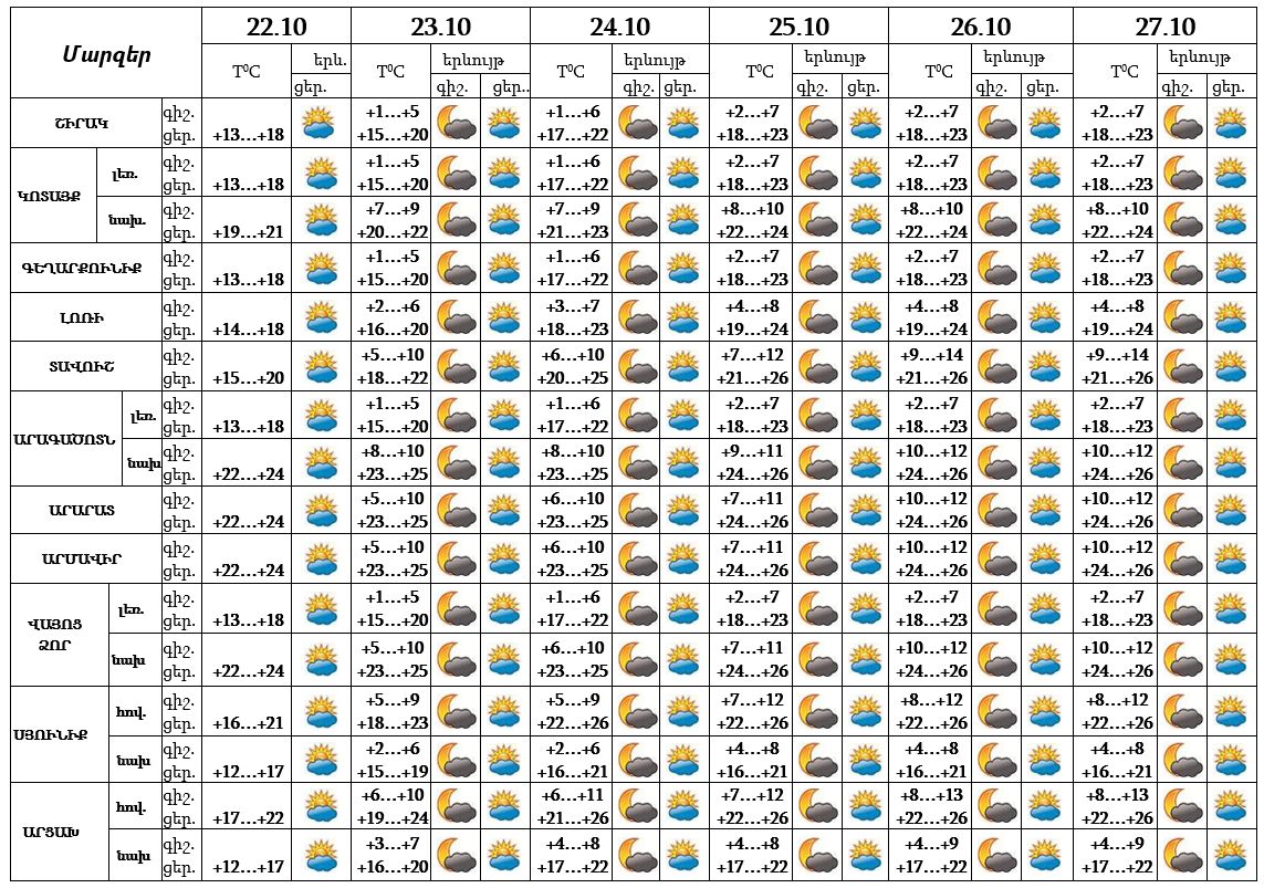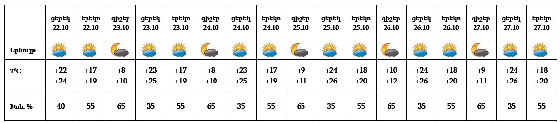 Հոկտեմբերի 22-ի ցերեկը, 23-27-ը սպասվում է առանց տեղումների եղանակ: