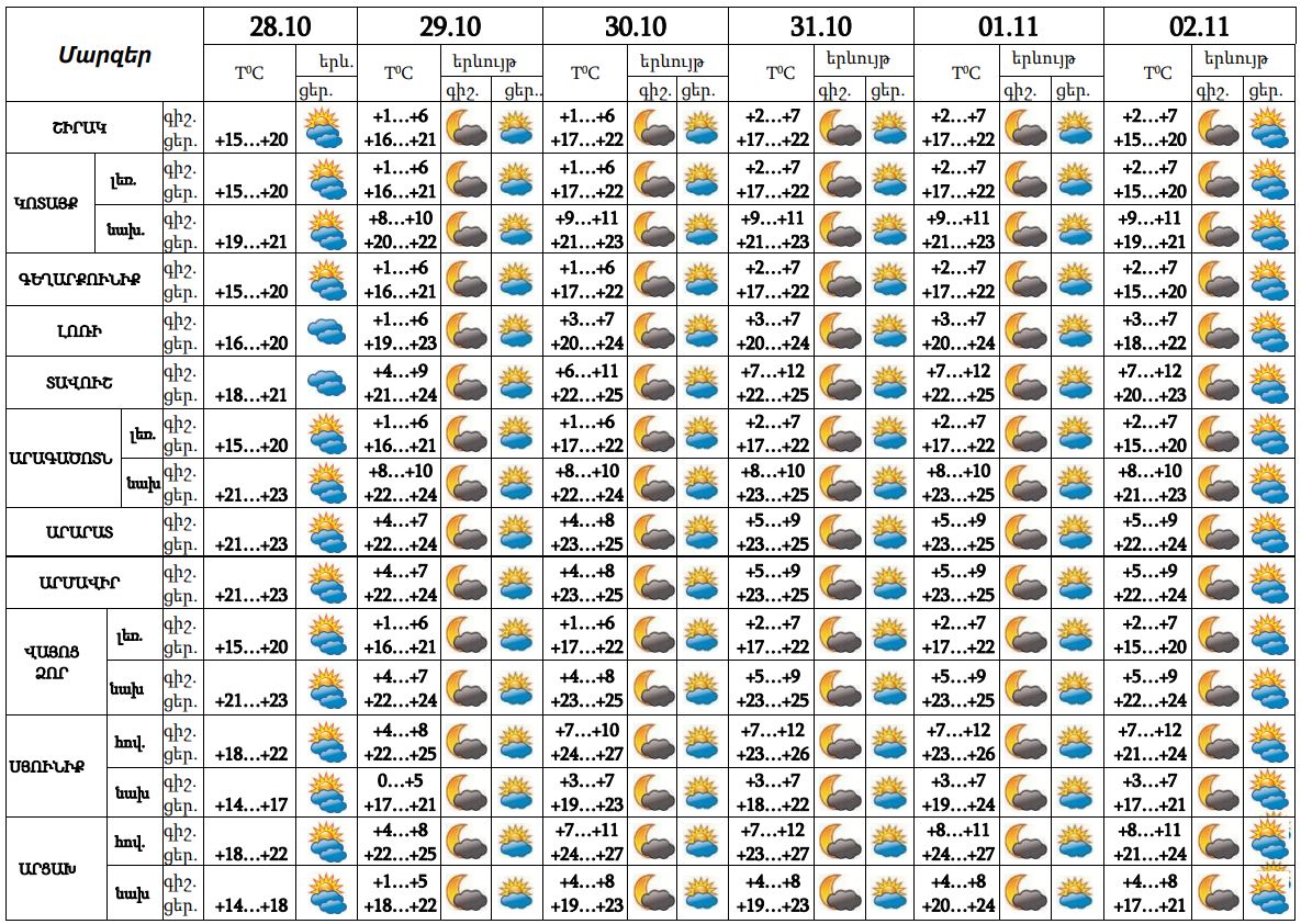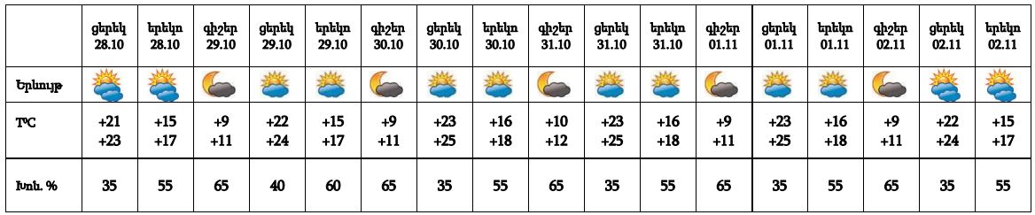 Օդի ջերմաստիճանը հոկտեմբերի 28-ի ցերեկը կնվազի 2-4 աստիճանով, 29-30-ն աստիճանաբար նույնքան կբարձրանա։