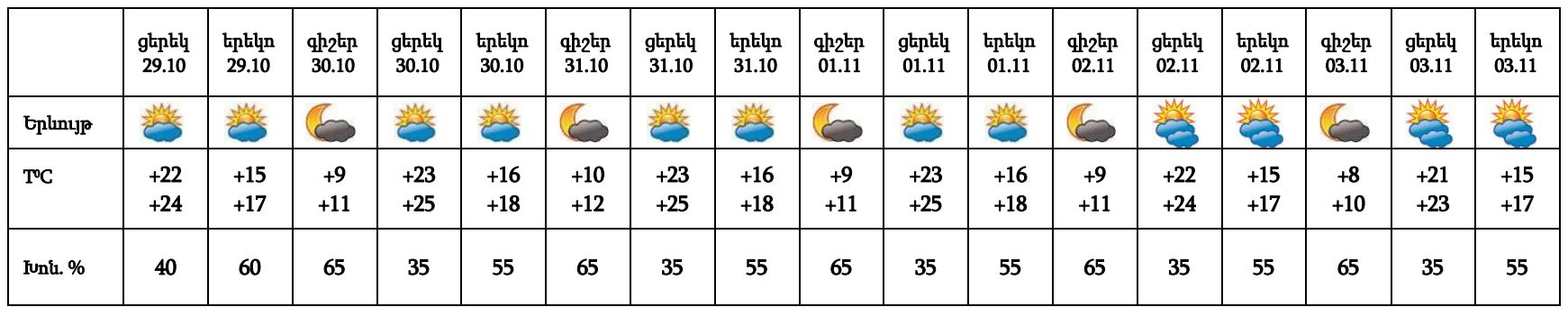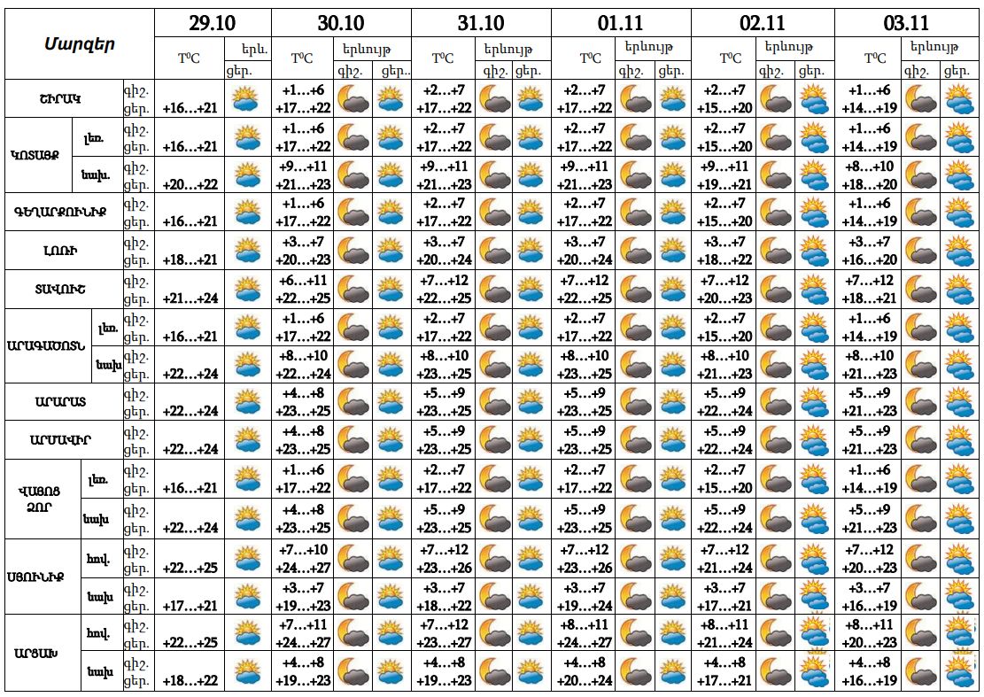 Հոկտեմբերի 29-ի ցերեկը, 30-31-ը և նոյեմբերի 1-3-ը սպասվում է առանց տեղումների եղանակ: