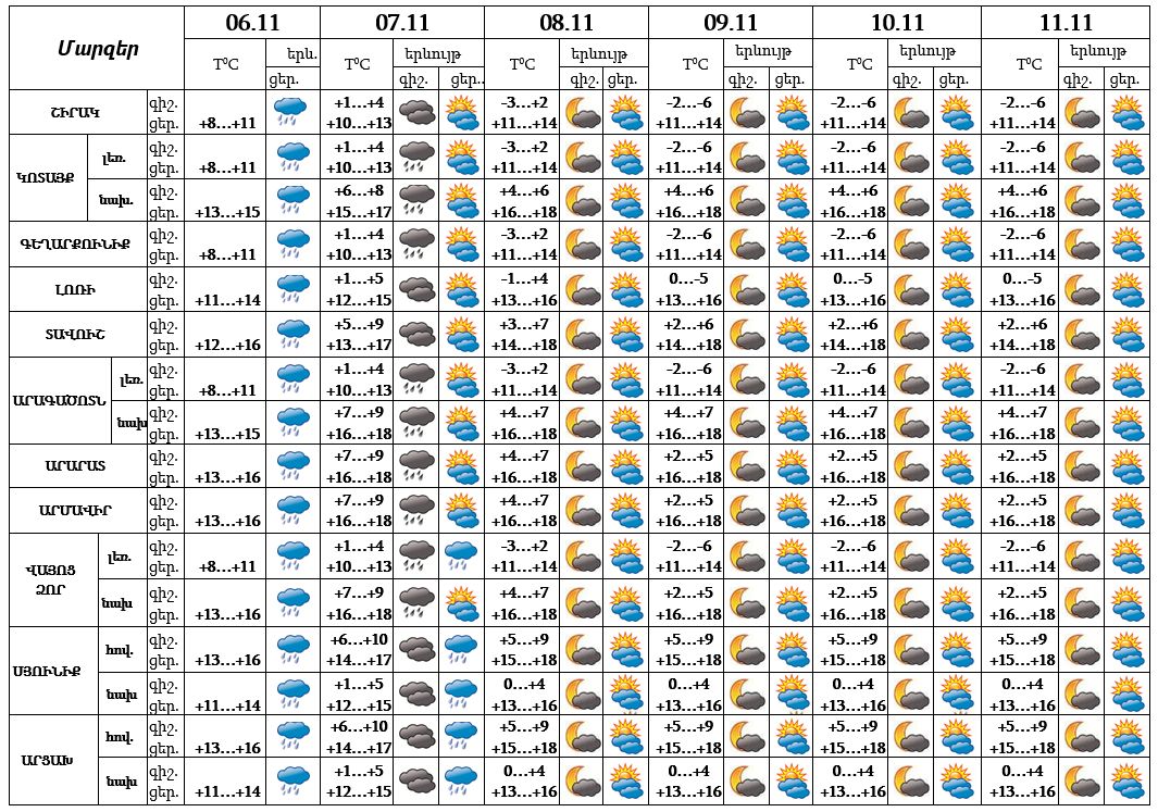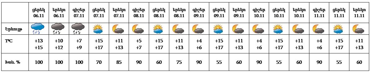 Նոյեմբերի 6-ի ցերեկը, 7-ի գիշերը ժամանակ առ ժամանակ սպասվում է անձրև։ Նոյեմբերի 7-ի ցերեկը, 8-11-ը սպասվում է առանց տեղումների եղանակ։