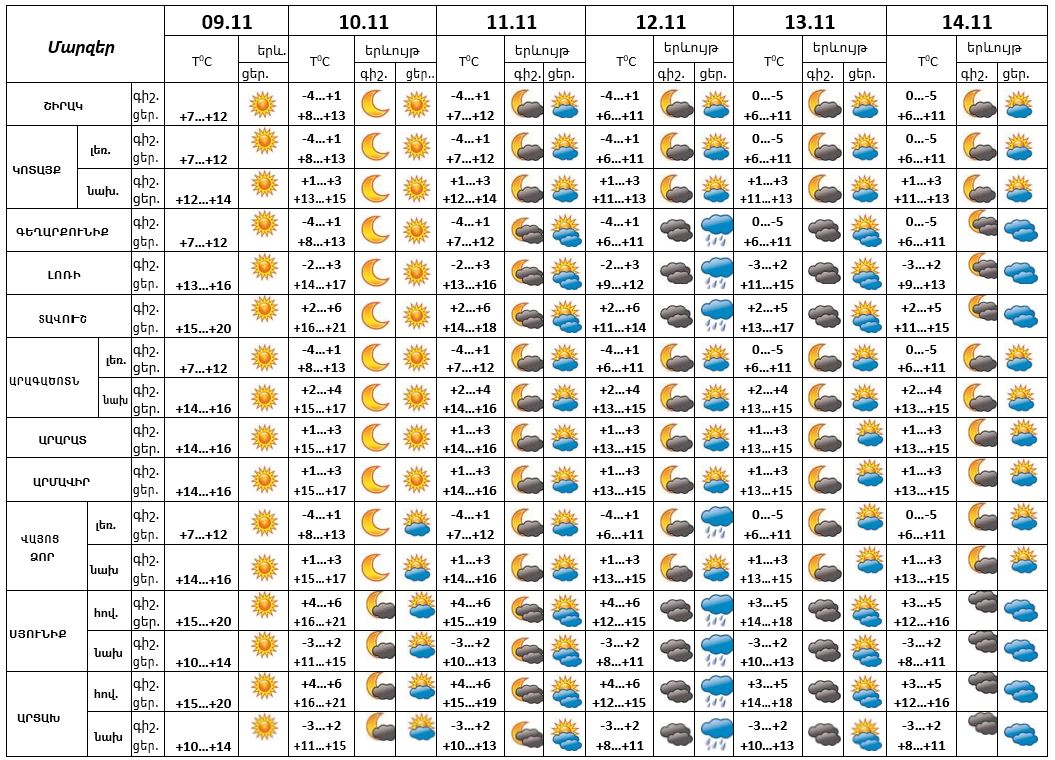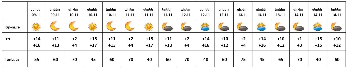 Նոյեմբերի 9-ի ցերեկը, 10-11-ը, 12-ի գիշերը և 13-14-ը սպասվում է առանց տեղումների եղանակ, 12-ի ցերեկն առանձին շրջաններում սպասվում է անձրև: