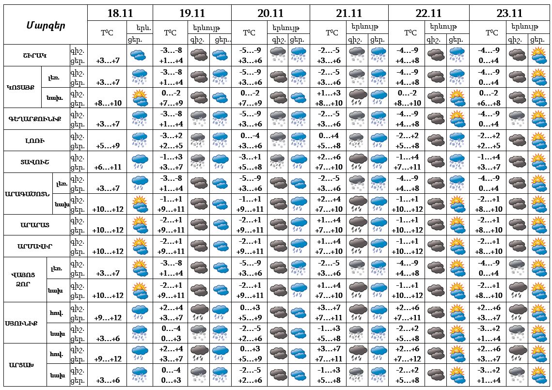 Օդի ջերմաստիճանը նոյեմբերի 18-19-ի ցերեկն աստիճանաբար կնվազի 2-3, Լոռիում, Տավուշում, Սյունիքում և Արցախում՝ 5-6 աստիճանով։