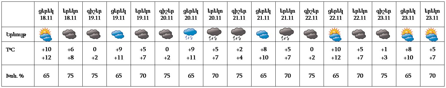 Նոյեմբերի 18-ի ցերեկը, 19-ին և 22-23-ը սպասվում է առանց տեղումների եղանակ, իսկ 20-21-ը սպասվում է անձրև։