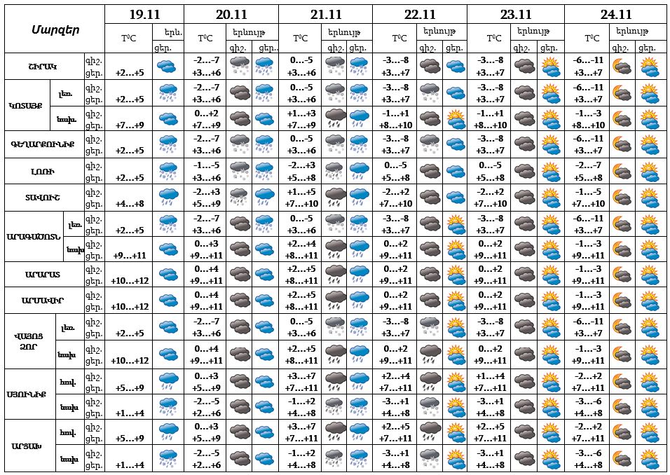 Նոյեմբերի 19-ի ցերեկը, 22-24-ը սպասվում է առանց տեղումների եղանակ, 20-ի երեկոյան ժամերին, 21-ին սպասվում է անձրև։