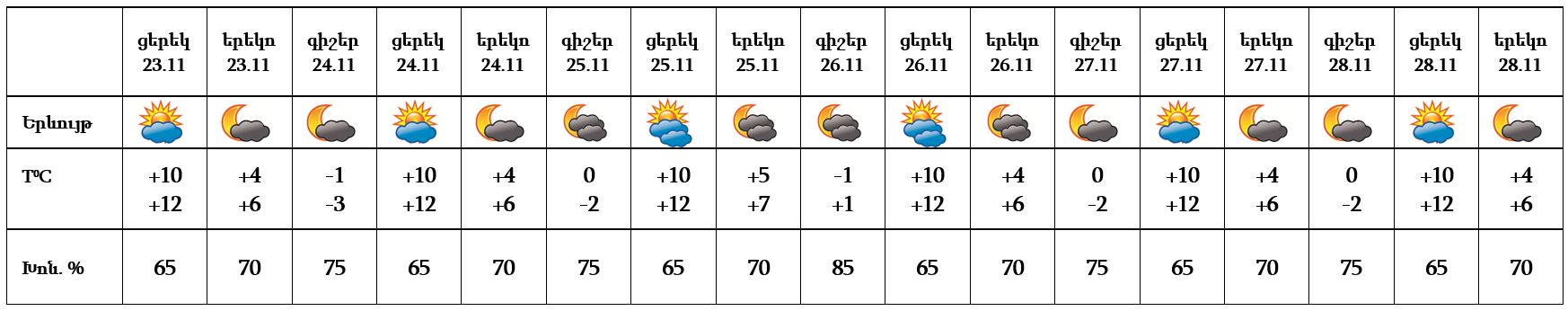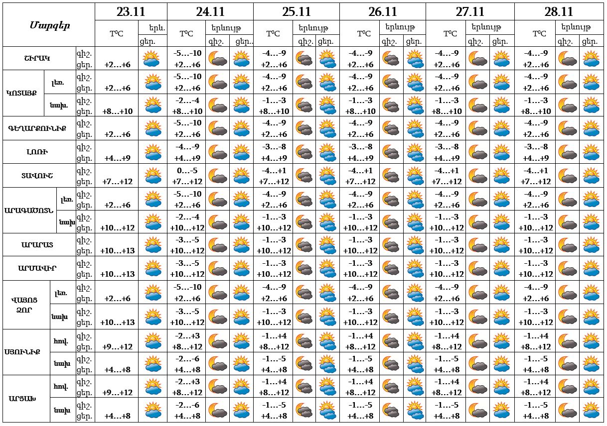 Նոյեմբերի 23-ի ցերեկը, 24-28-ը սպասվում է առանց տեղումների եղանակ։