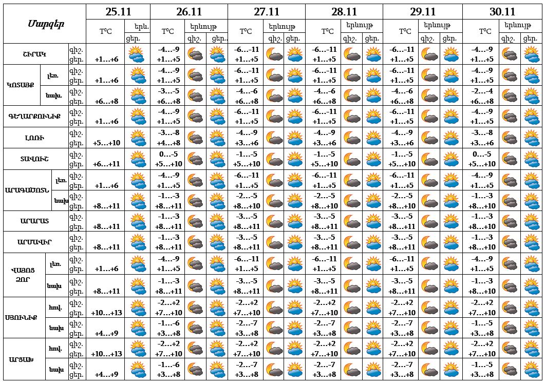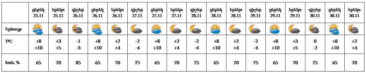 Նոյեմբերի 25-ի ցերեկը, 26-30-ը սպասվում է առանց տեղումների եղանակ։
