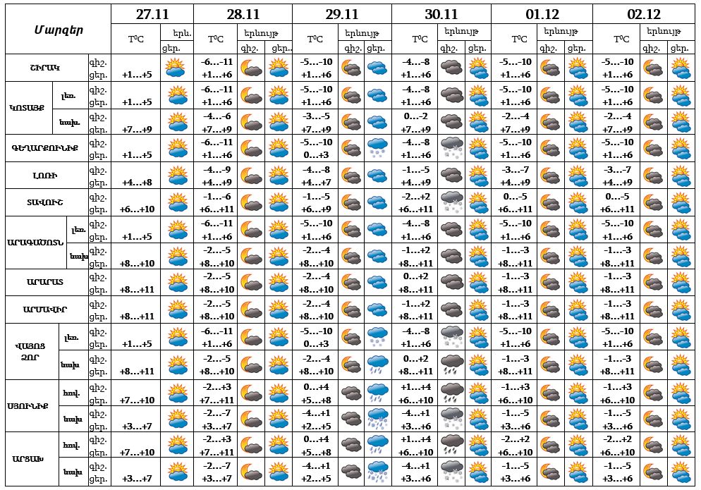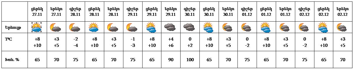 Նոյեմբերի 27-ի ցերեկը, 28-ին, 29-ի գիշերը, 30-ի ցերեկը, դեկտեմբերի 1-2-ը սպասվում է առանց տեղումների եղանակ։ Նոյեմբերի 29-ի ցերեկը, 30-ի գիշերն առանձին շրջաններում սպասվում են տեղումներ։