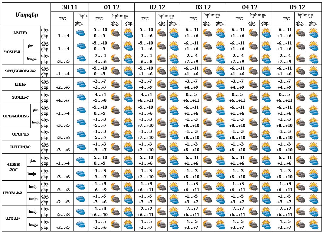 Նոյեմբերի 30-ի ցերեկը, դեկտեմբերի 1-5-ը սպասվում է առանց տեղումների եղանակ, առանձին վայրերում գիշերը և առավոտյան ժամերին սպասվում է մառախուղ։