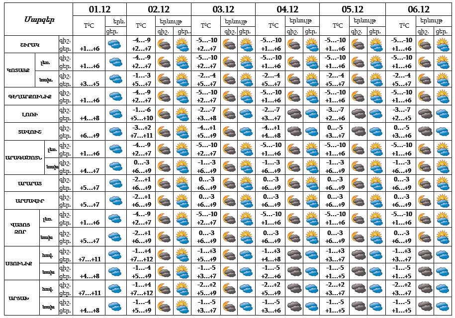 Դեկտեմբերի 1-ի ցերեկը, 2-6-ը սպասվում է առանց տեղումների եղանակ, գիշերը և առավոտյան ժամերին` մառախուղ։