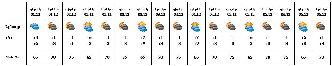 Դեկտեմբերի 1-ի ցերեկը, 2-6-ը սպասվում է առանց տեղումների եղանակ, առանձին վայրերում՝ գիշերը և առավոտյան ժամերին սպասվում է մառախուղ։