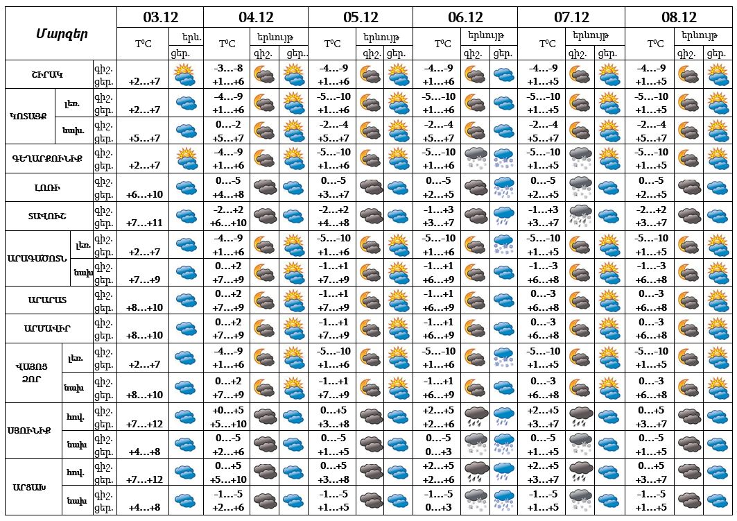 Դեկտեմբերի 3-ի ցերեկը, 4-5-ը, 7-ի ցերեկը, 8-ին սպասվում է առանց տեղումների եղանակ, 6-ին, 7-ի գիշերն առանձին շրջաններում սպասվում են տեղումներ, առանձին վայրերում գիշերը և առավոտյան ժամերին սպասվում է մառախուղ։