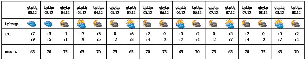 Դեկտեմբերի 3-ի ցերեկը, 4-8-ը սպասվում է առանց տեղումների եղանակ, գիշերը և առավոտյան ժամերին` մառախուղ։