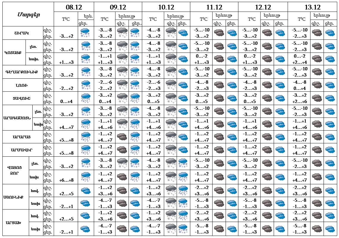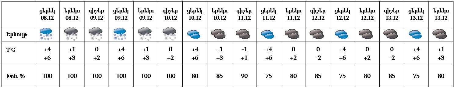 Դեկտեմբերի 8-ի ցերեկը, 9-ին, 10-ի գիշերը ժամանակ առ ժամանակ սպասվում են տեղումներ՝ թաց ձյան և ձնախառն անձրևի տեսքով։ Դեկտեմբերի 10-ի ցերեկը, 11-13-ը սպասվում է առանց տեղումների եղանակ։ Գիշերը և առավոտյան ժամերին սպասվում է մառախուղ։