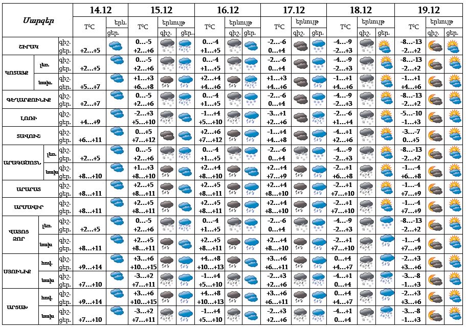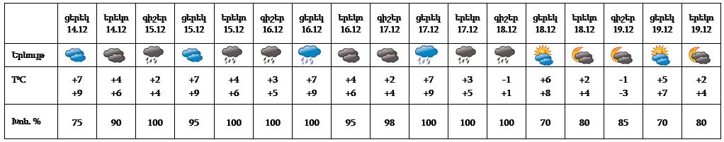 Դեկտեմբերի 14-ի ցերեկը, 19-ին սպասվում է առանց տեղումների եղանակ, 15-17-ը, 18-ի գիշերը ժամանակ առ ժամանակ շրջանների զգալի մասում, 18-ի ցերեկը Վայոց ձորում, Սյունիքում և Արցախում սպասվում են տեղումներ՝ լեռնային շրջաններում ձյան տեսքով։ Առանձին վայրերում գիշերը և առավոտյան ժամերին սպասվում է մառախուղ: