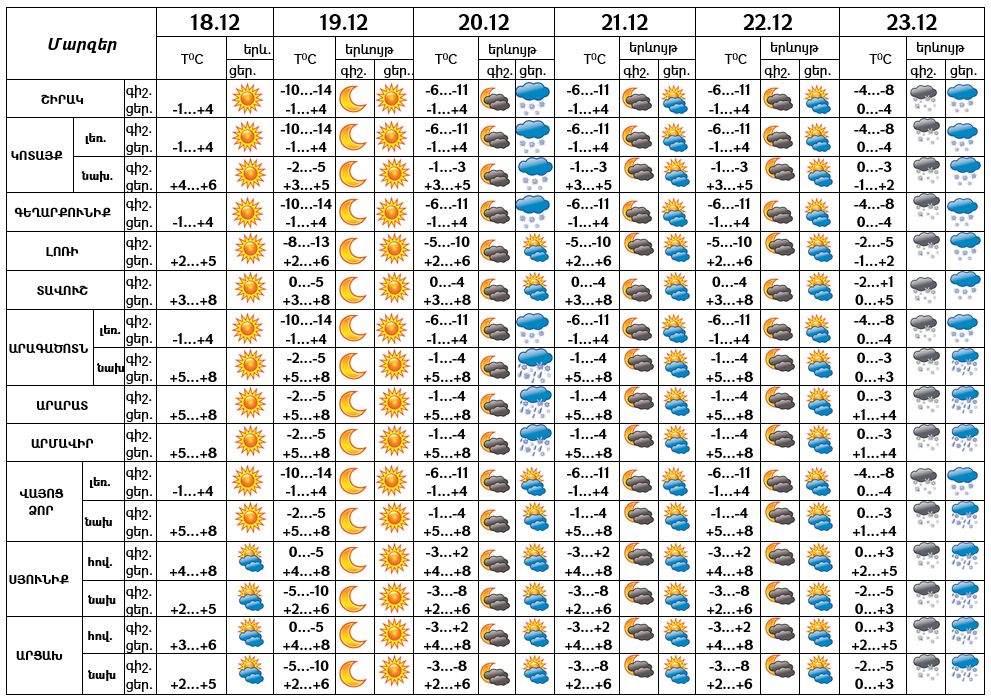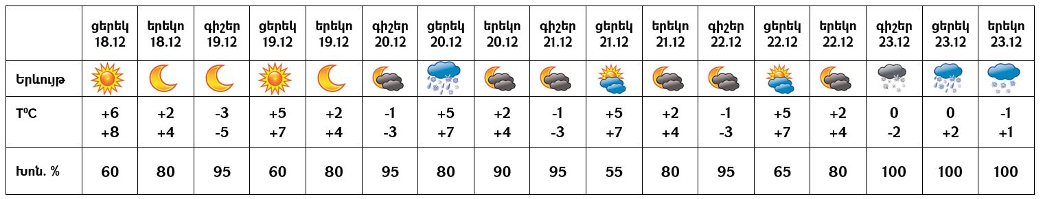 Դեկտեմբերի 18-ի ցերեկը, 19-ին, 21-22-ը սպասվում է առանց տեղումների եղանակ։ Դեկտեմբերի 20-ի ցերեկը, 23-ին սպասվում են տեղումներ, բարձրադիր գոտում՝ ձյան տեսքով։