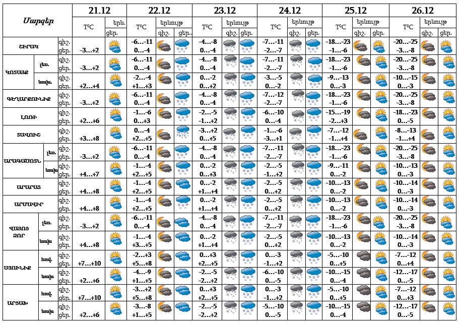 Դեկտեմբերի 21-ի ցերեկը, 22-ի գիշերը, 25-26-ը սպասվում է առանց տեղումների եղանակ։ Դեկտեմբերի 22-ի ցերեկն առանձին շրջաններում, 23-24-ը շրջանների զգալի մասում սպասվում է ձյուն, առանձին հատվածներում՝ ինտենսիվ, լեռնային շրջաններում և լեռնանցքներում՝ բուք, ճանապարհներին՝ մերկասառույց: