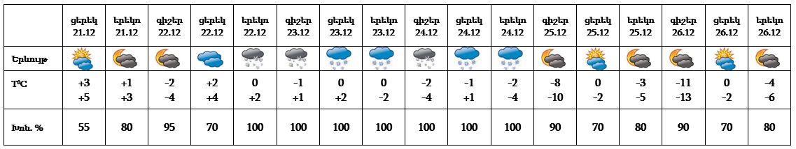 Դեկտեմբերի 21-ի ցերեկը, 22-ի գիշերը, 25-26-ը սպասվում է առանց տեղումների եղանակ։ Դեկտեմբերի 22-ի կեսօրից հետո, 23-24-ը սպասվում է ձյուն, գիշերը և առավոտյան ճանապարհներին՝ մերկասառույց։