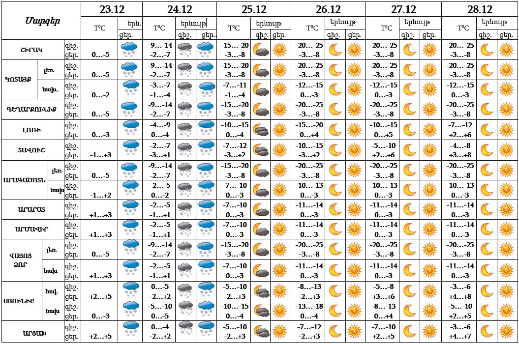 Դեկտեմբերի 23-ի ցերեկը, 24-ին շրջանների զգալի մասում սպասվում է ձյուն, առանձին հատվածներում՝ ինտենսիվ, լեռնային շրջաններում և լեռնանցքներում՝ բուք, ճանապարհներին՝ մերկասառույց: Դեկտեմբերի 25-28-ը սպասվում է առանց տեղումների եղանակ։