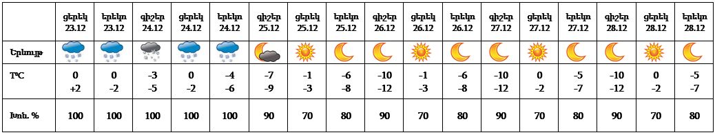 Դեկտեմբերի 23-ի ցերեկը, 24-ին սպասվում է ձյուն, ճանապարհներին գիշերը և առավոտյան ժամերին՝ մերկասառույց։ Դեկտեմբերի 25-28-ը սպասվում է առանց տեղումների եղանակ։
