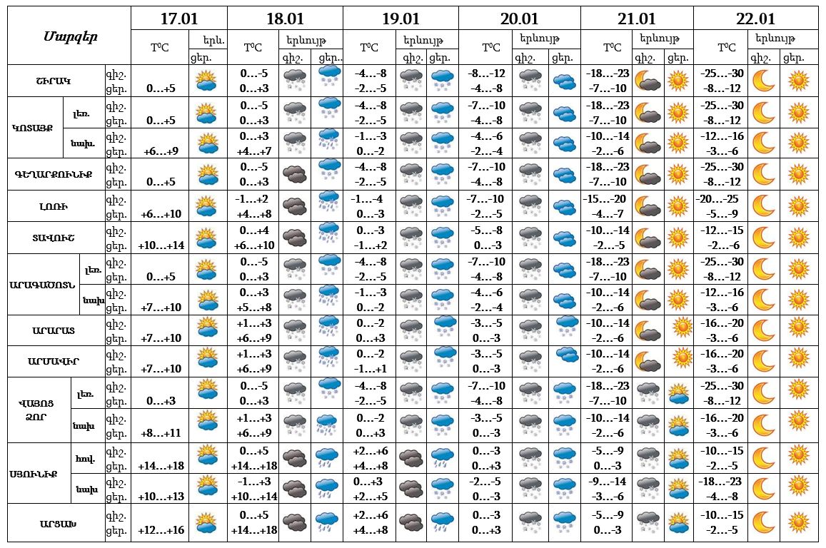 Հունվարի 19-ին և 19-ի լույս 20-ի գիշերը հանրապետության ողջ տարածքում սպասվում է ձյուն, առանձին վայրերում՝ ինտենսիվ, լեռնային շրջաններում սպասվում է նաև բուք, ցածր հորիզոնական տեսանելիույթուն, ճանապարհներին՝ մերկասառույց։ Օդի ջերմաստիճանը 19-22-ն աստիճանաբար կնվազի 17-20 աստիճանով։