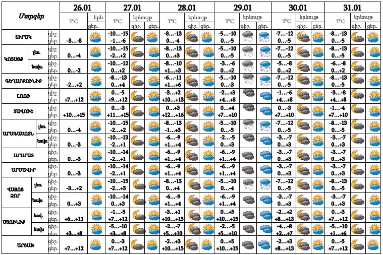 Հունվարի 26-ի ցերեկը, 27-28-ը, 30-31-ը սպասվում է առանց տեղումների եղանակ։ Հունվարի 29-ին առանձին շրջաններում սպասվում է ձյուն: