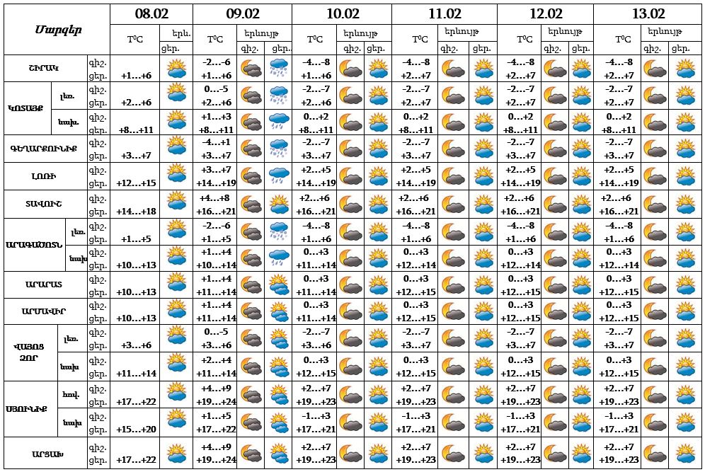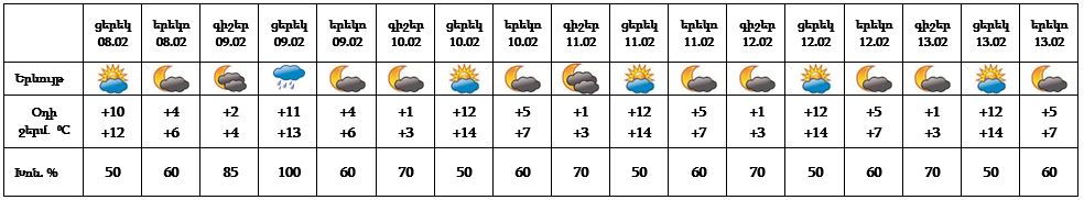 Փետրվարի 8-ի ցերեկը, 9-ի գիշերը, 10-13-ը սպասվում է առանց տեղումների եղանակ: Փետրվարի 9-ի ցերեկը առանձին շրջաններում սպասվում են թույլ և կարճատև տեղումներ: