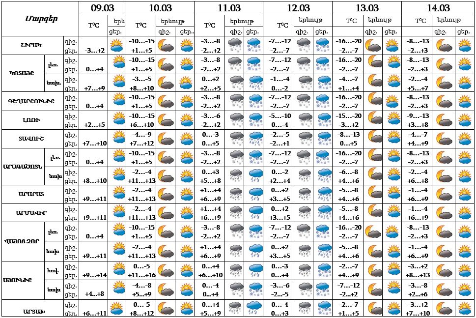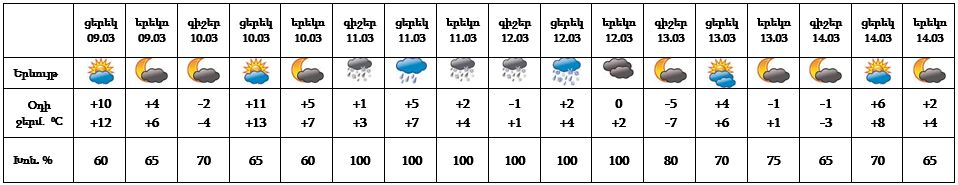 Մարտի 9-ի ցերեկը, 10-ին, 13-14-ը սպասվում է առանց տեղումների եղանակ, 11-12-ը հանրապետության ողջ տարածքում սպասվում են տեղումներ, լեռնային և նախալեռնային շրջաններում՝ ձյան տեսքով։